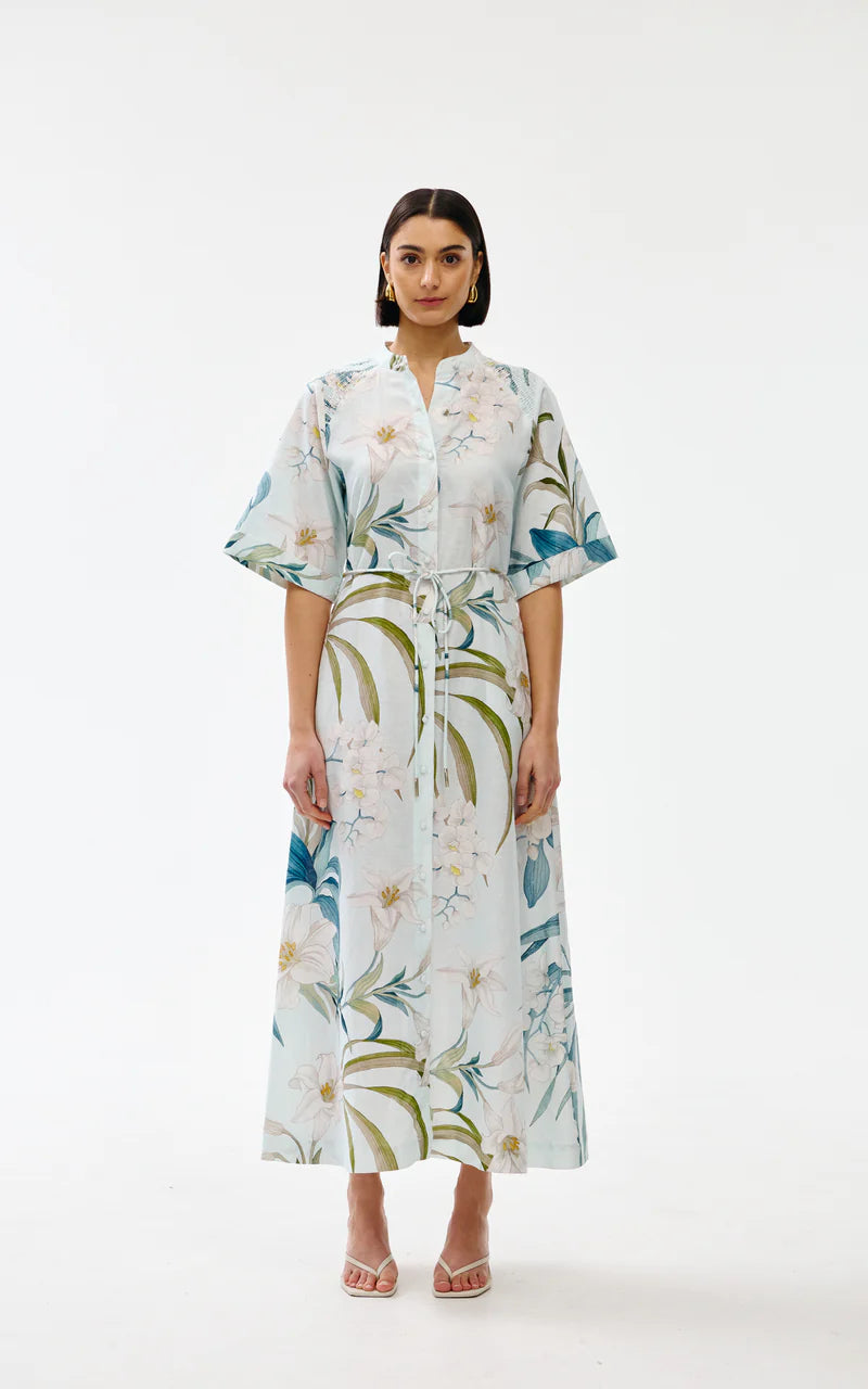 The Gigi Dress in Portofino is an ode to breezy coastal elegance. Featuring a flowing silhouette with a soft botanical print, this shirt-style dress can be cinched at the waist with a detachable tie, offering adjustable shape and comfort.