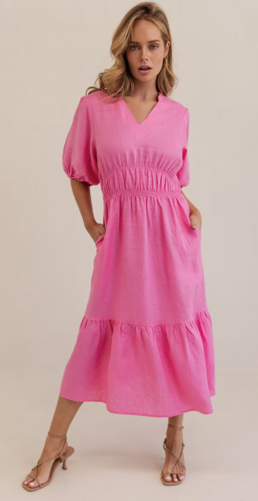 Breeze through your day in the K103 Linen Gather Detail Dress in pretty pink. Crafted from 100% linen, this dress offers breathable comfort with charming gathered details that add a fun, flirty touch. Perfect for sunny days when you want to feel effortlessly stylish and playful.
