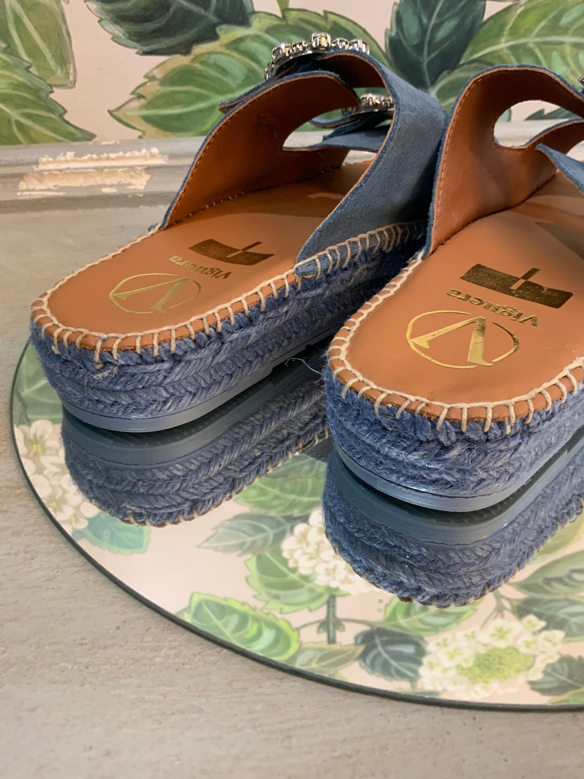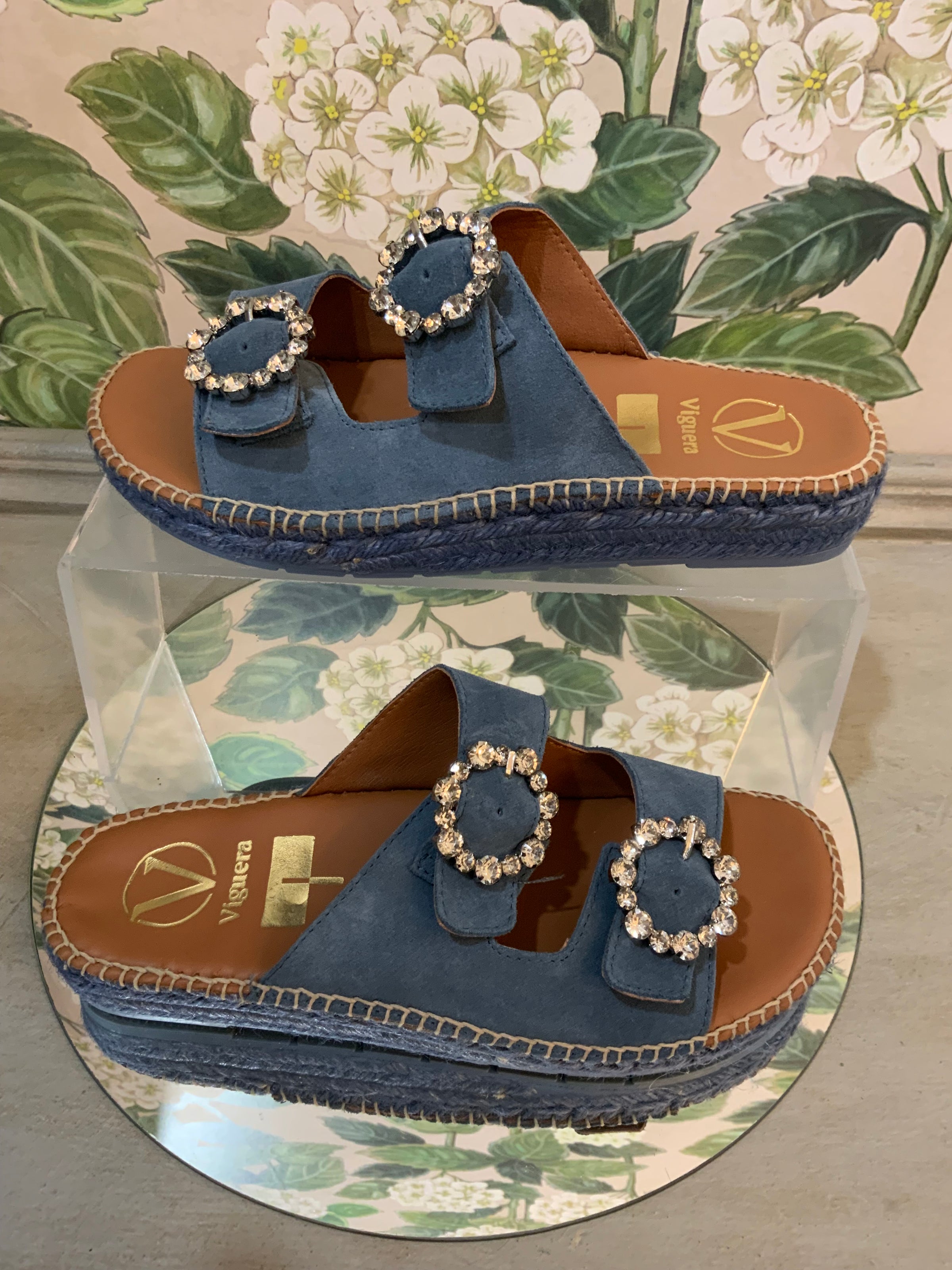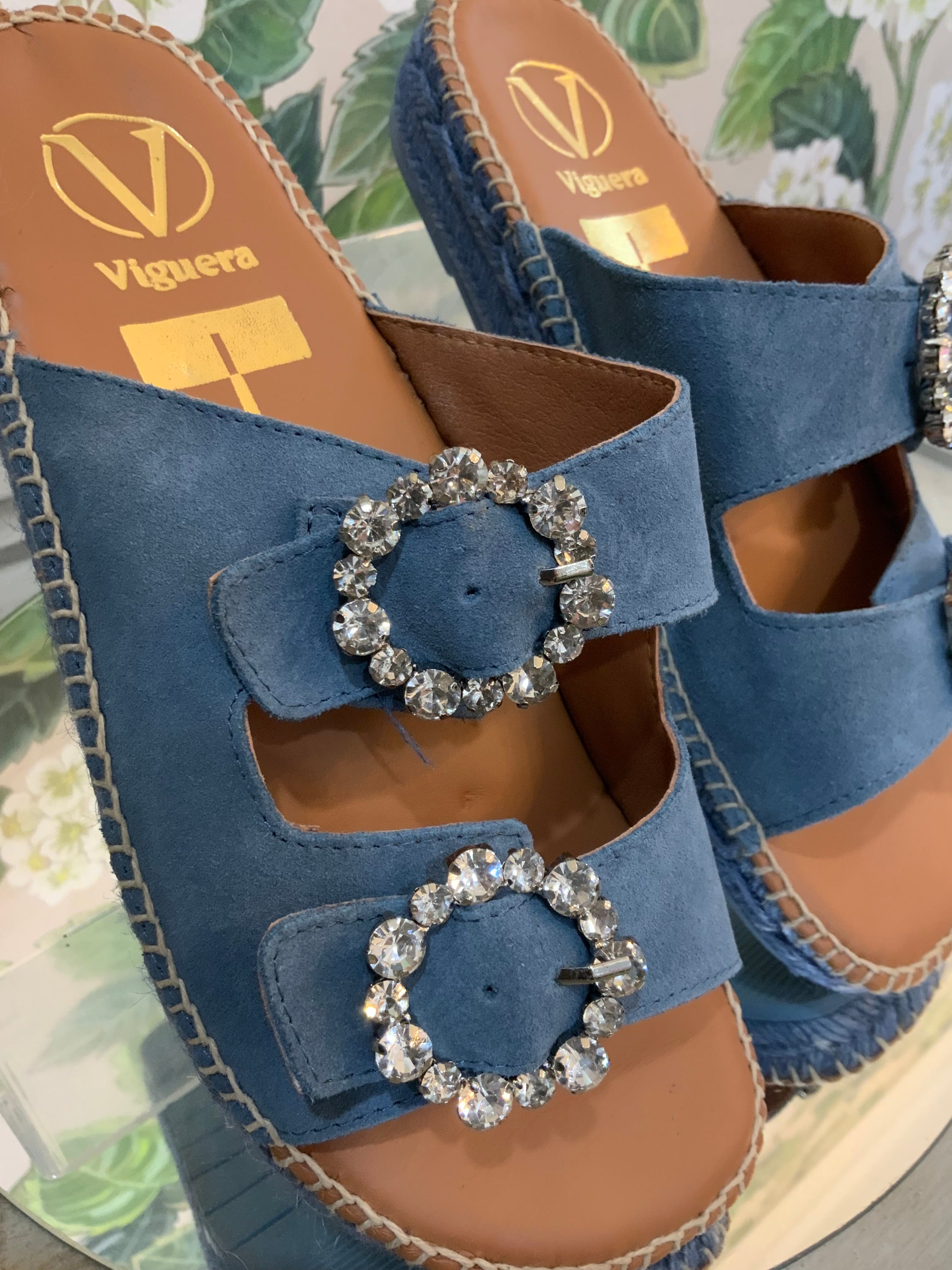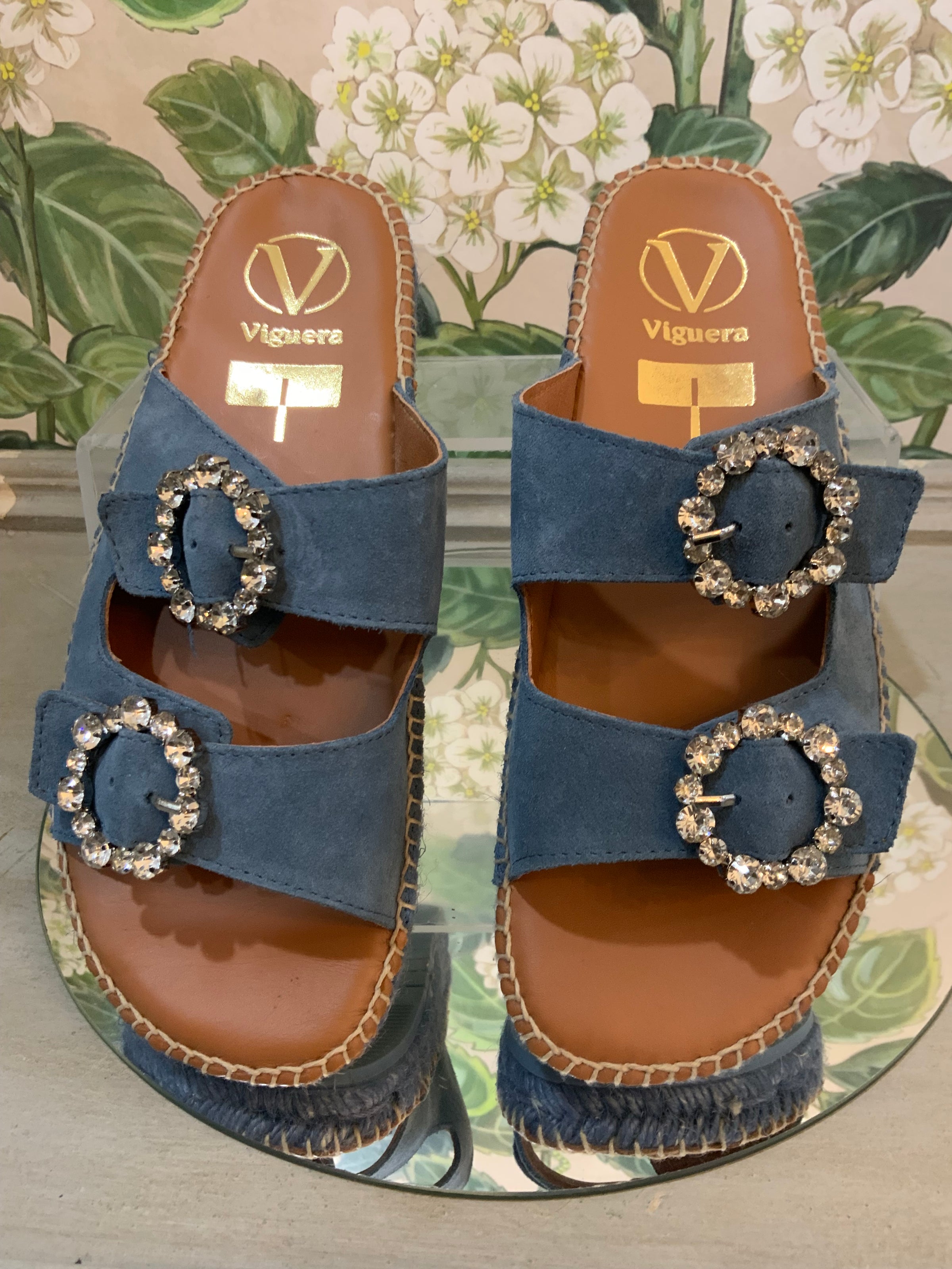 Step into effortless elegance with these handcrafted Viguera sandals, made in Spain. Designed in a rich blue suede, they feature two statement straps adorned with sparkling crystal-embellished buckles that add a touch of glamour to everyday wear.