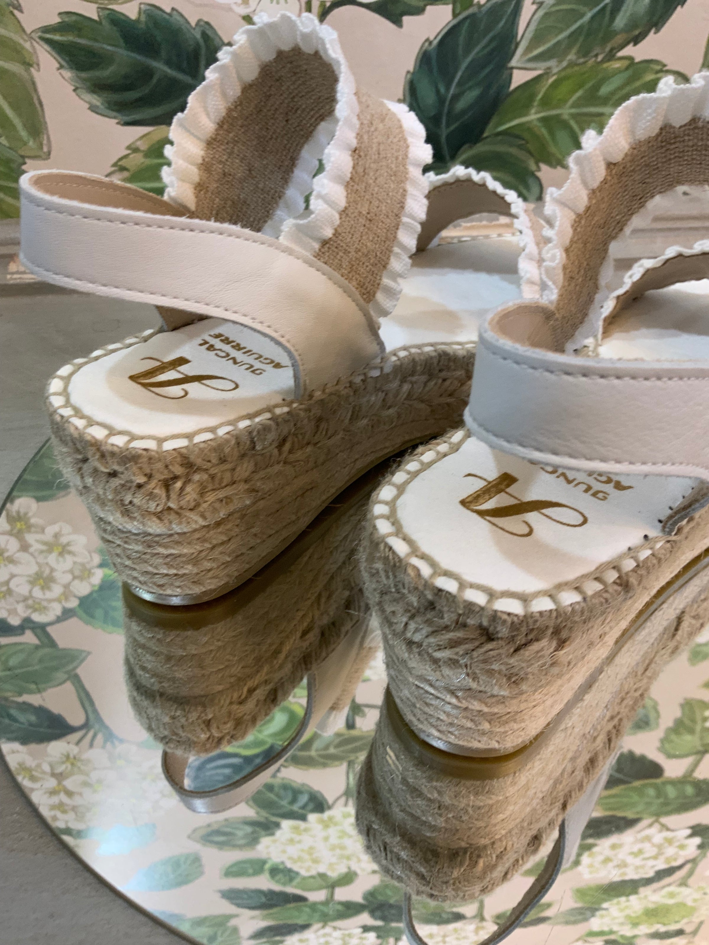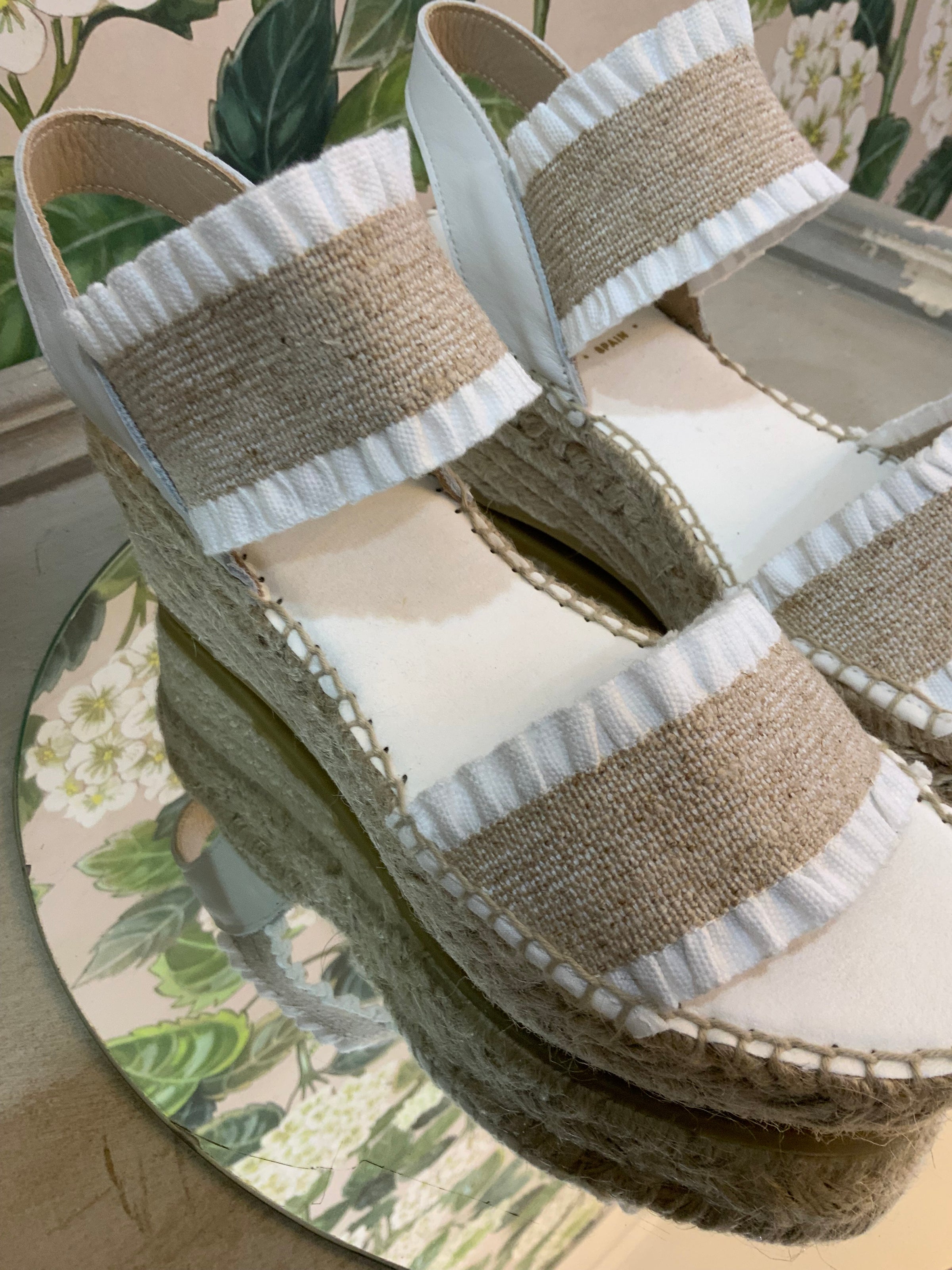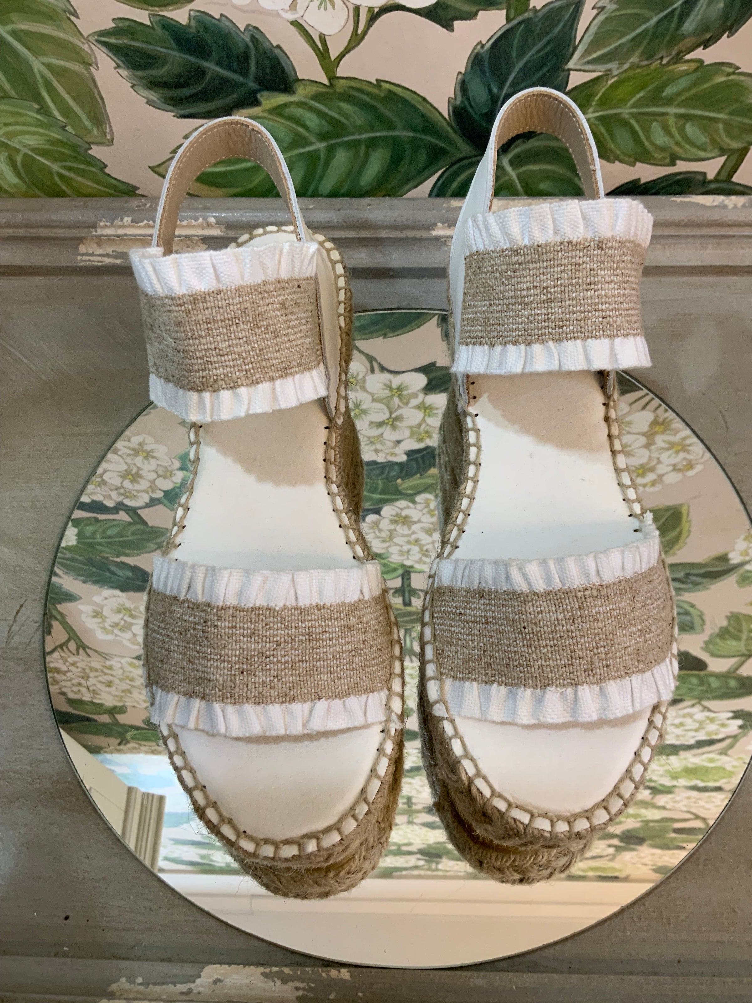 Step into timeless style with these handcrafted espadrille wedges. Designed with natural jute detailing and charming white ruffle trim, they’re the perfect mix of rustic elegance and everyday comfort.