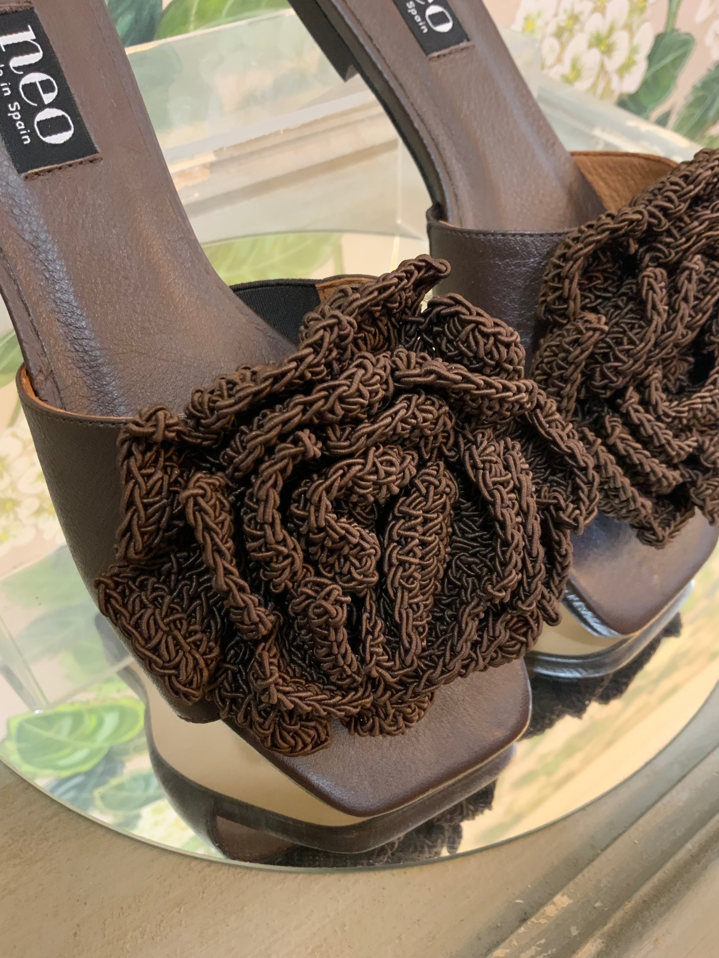Step into effortless elegance with these handcrafted Neo sandals, proudly made in Spain. Featuring a rich chocolate brown base, they’re adorned with an intricate oversized flower detail made from woven rope, creating a striking yet feminine statement.