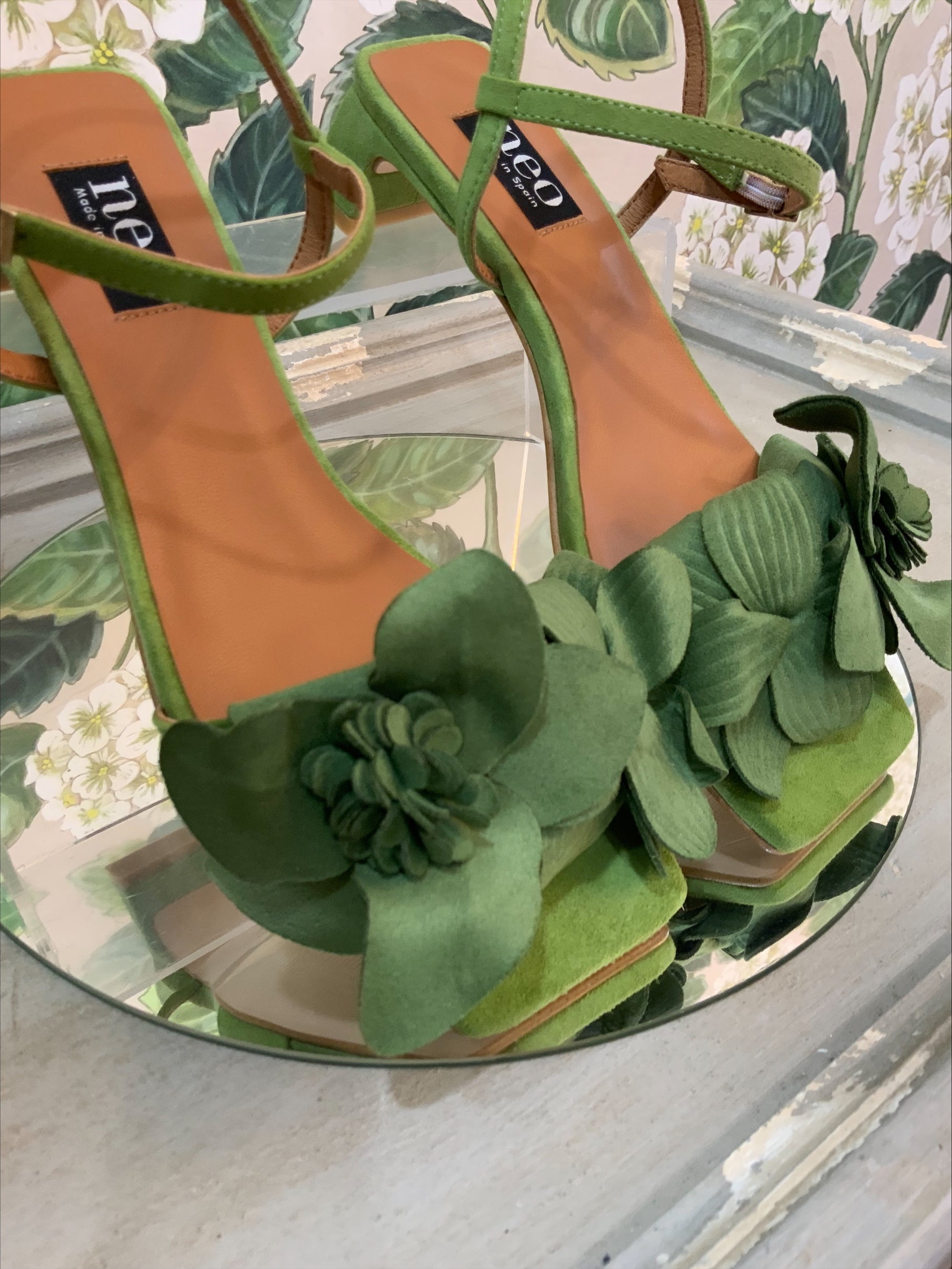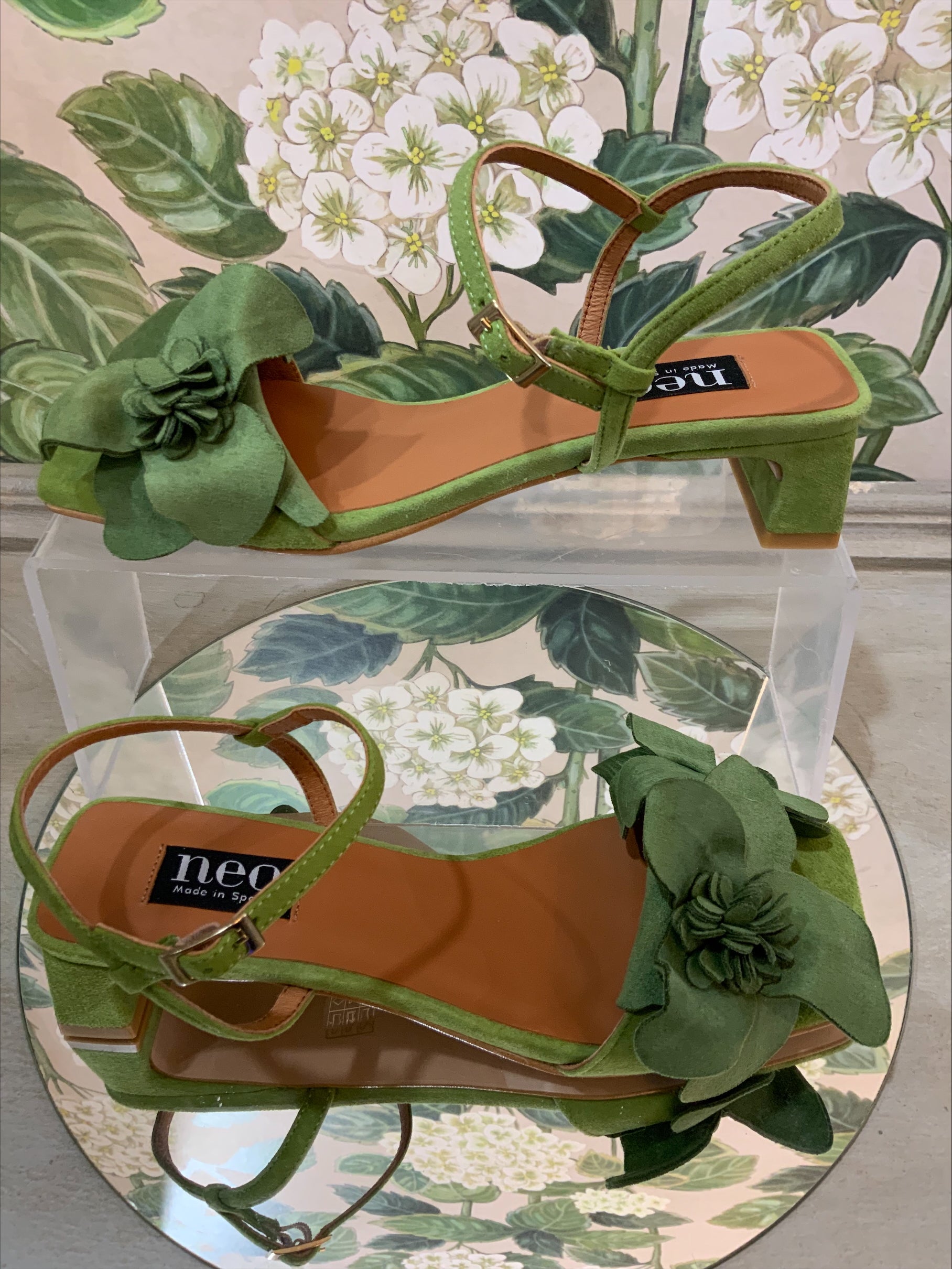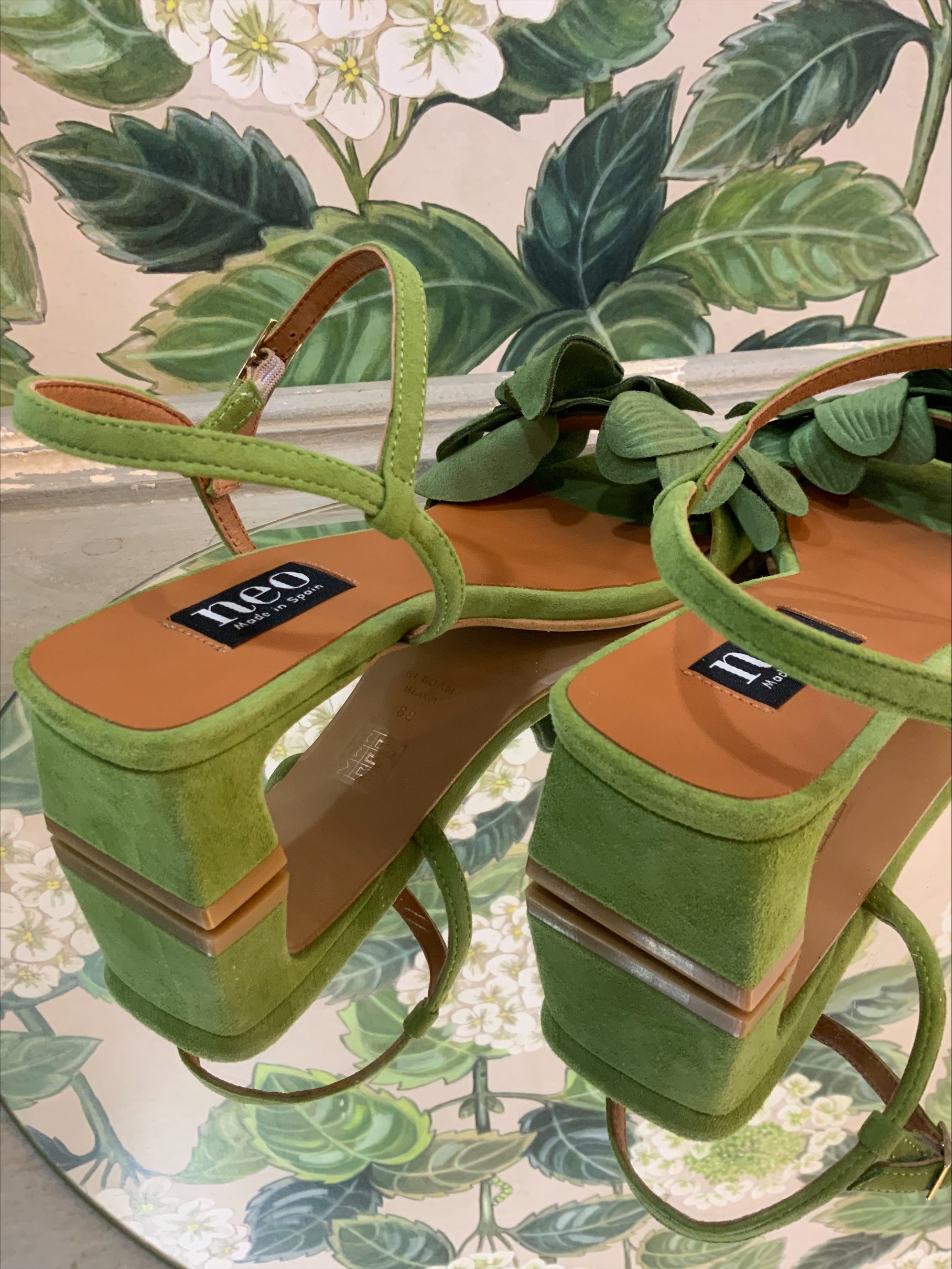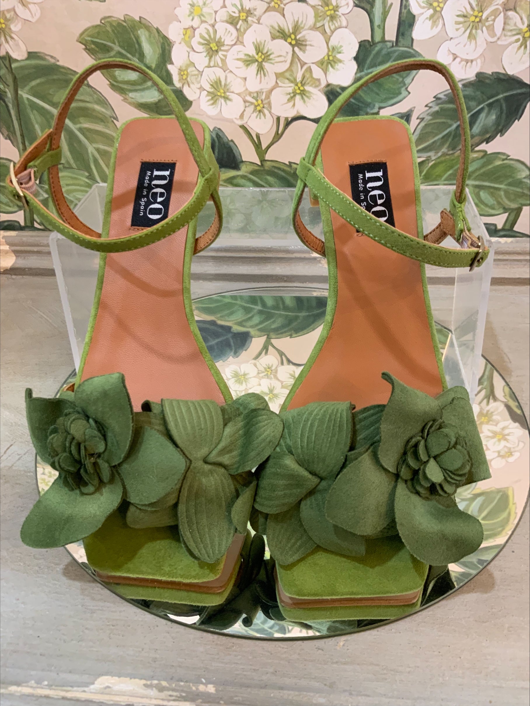 Fresh, bold, and effortlessly chic — these Neo sandals, crafted in Spain, are the perfect statement piece for any wardrobe. Designed in vibrant green suede, they feature oversized floral appliqués that add a playful yet elegant touch.