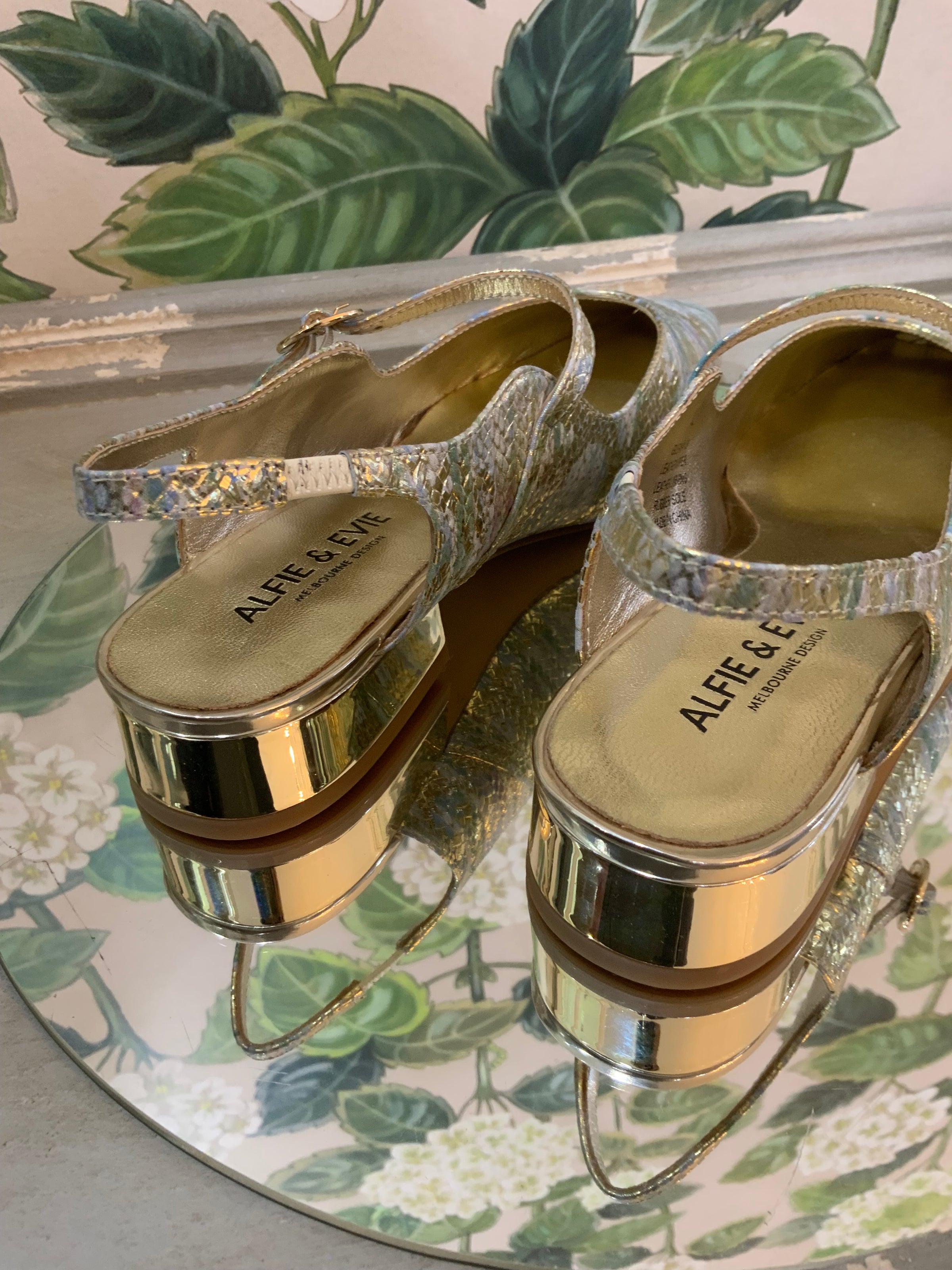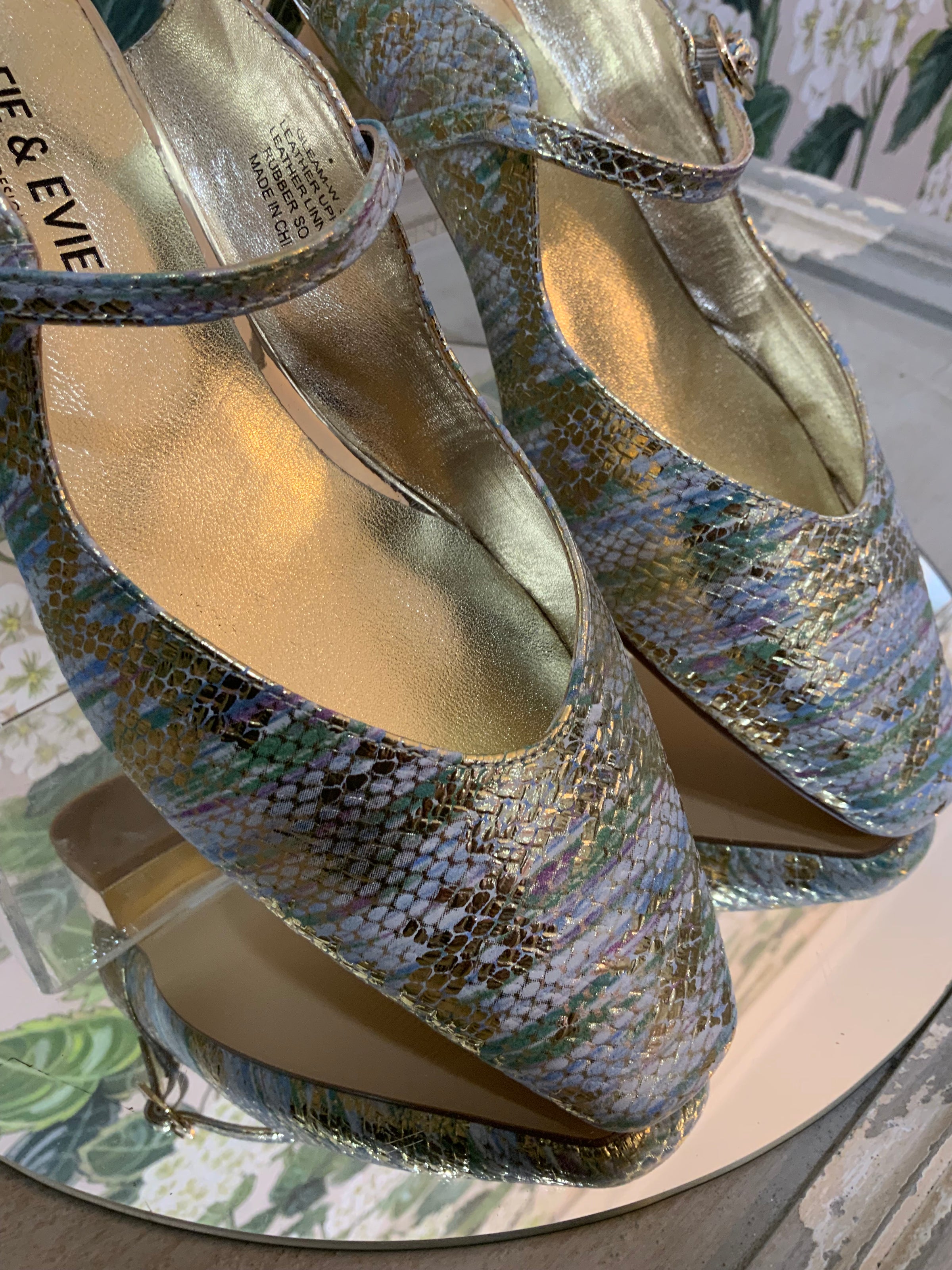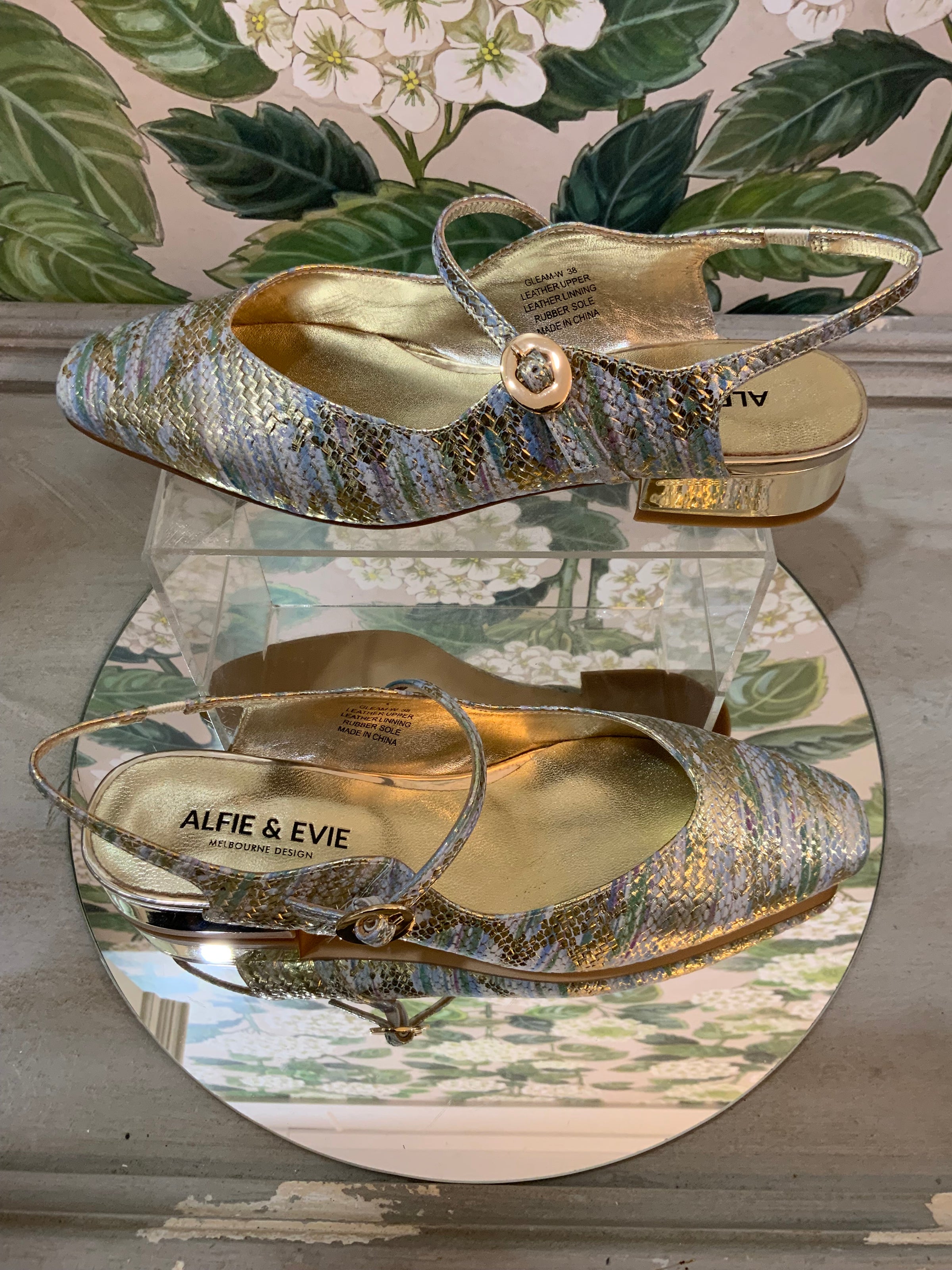 Make a statement in these shimmering snake-print Mary Jane shoes by Alfie & Evie. Designed with a textured metallic upper in iridescent tones, they catch the light beautifully while offering everyday comfort. The adjustable strap with a gold buckle ensures a secure fit, while the low platform heel with a glossy metallic finish adds height without compromising stability.
