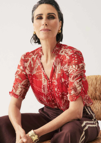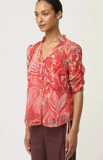 The Crimson Palms print delivers bold impact through rich red tones and intricate botanical motifs, creating a look that feels both contemporary and timeless. Featuring a soft V-neckline, covered button front, and gently gathered sleeves, the Lunette Blouse is designed to flatter while maintaining relaxed elegance.