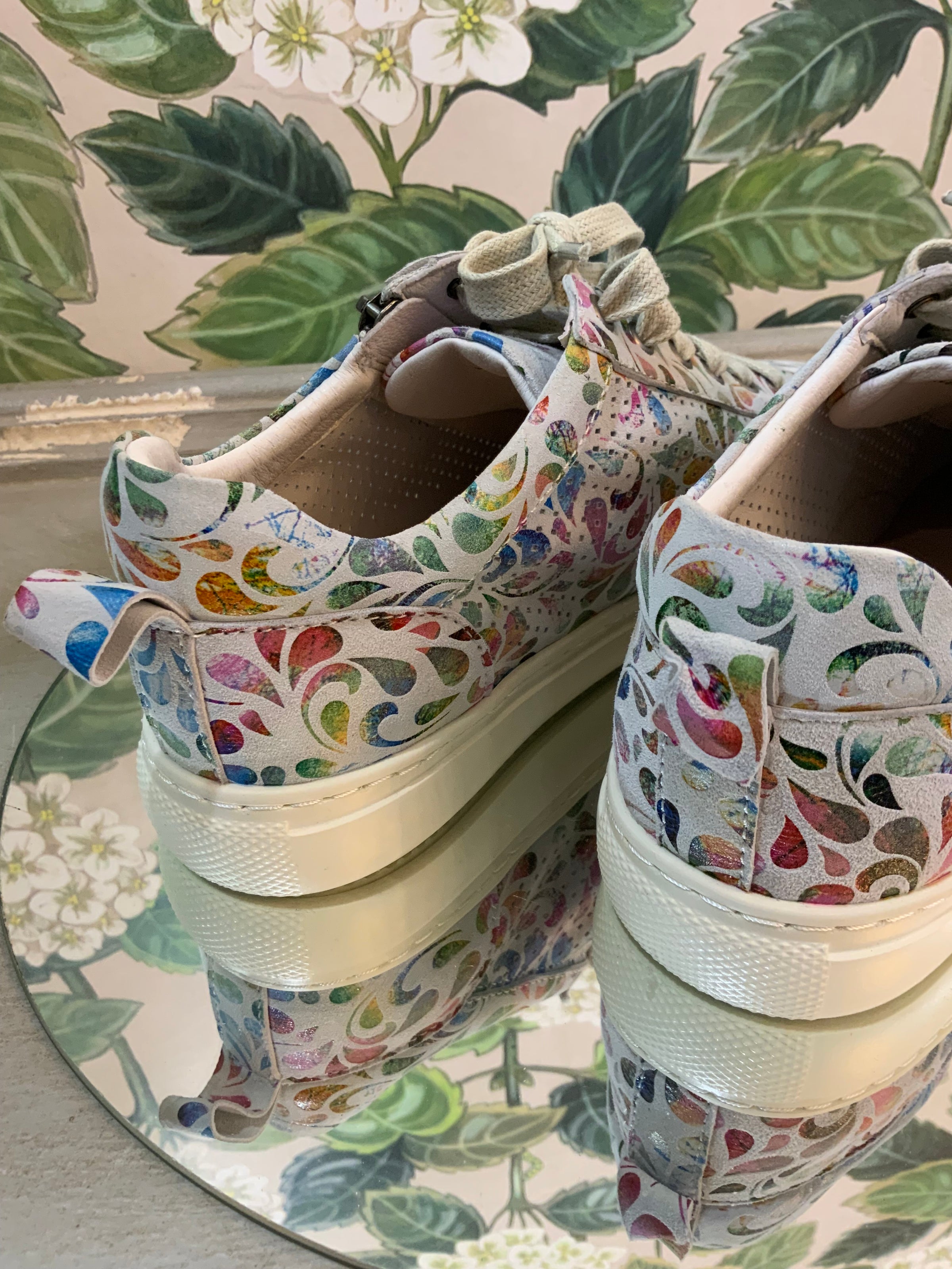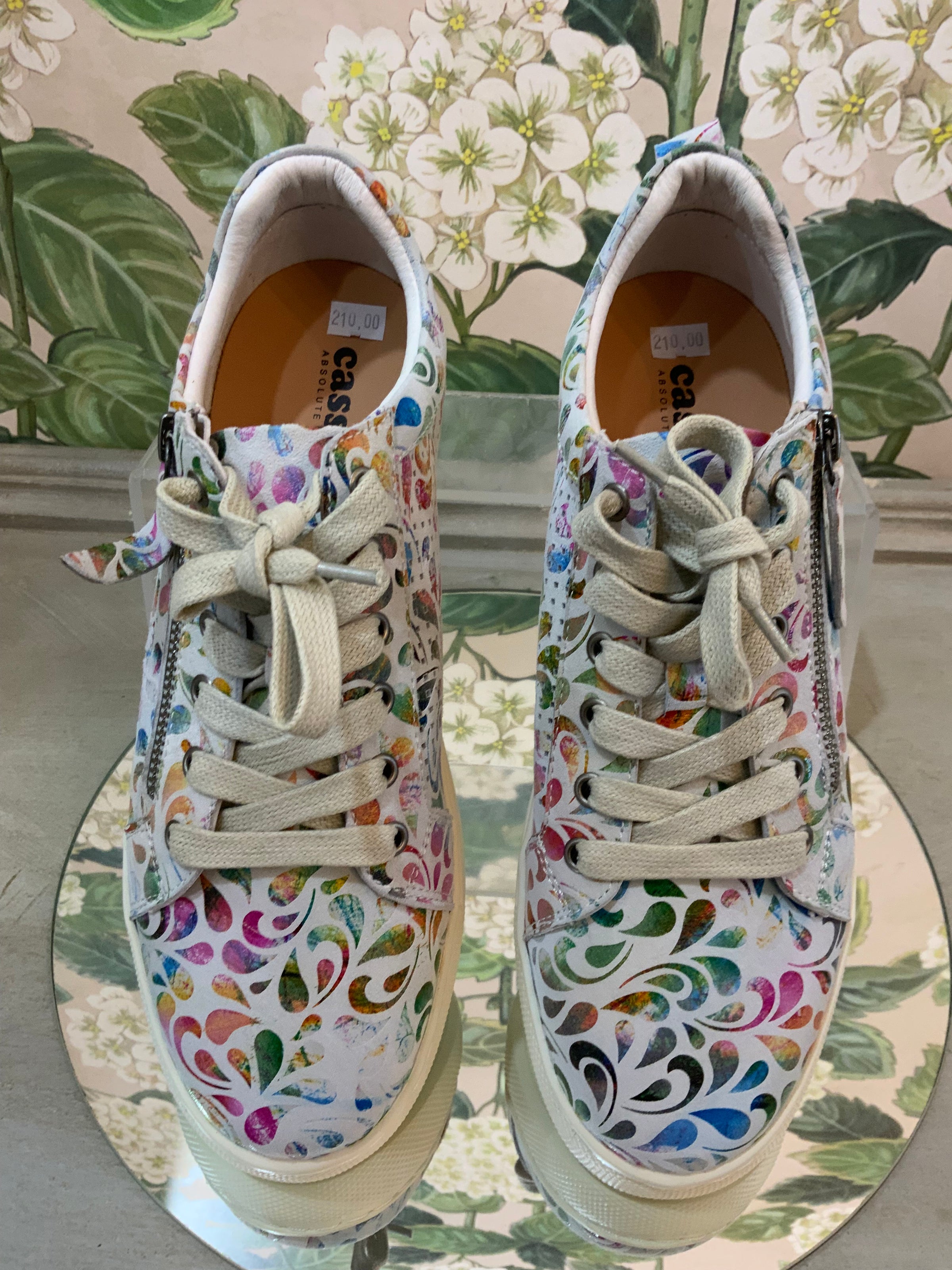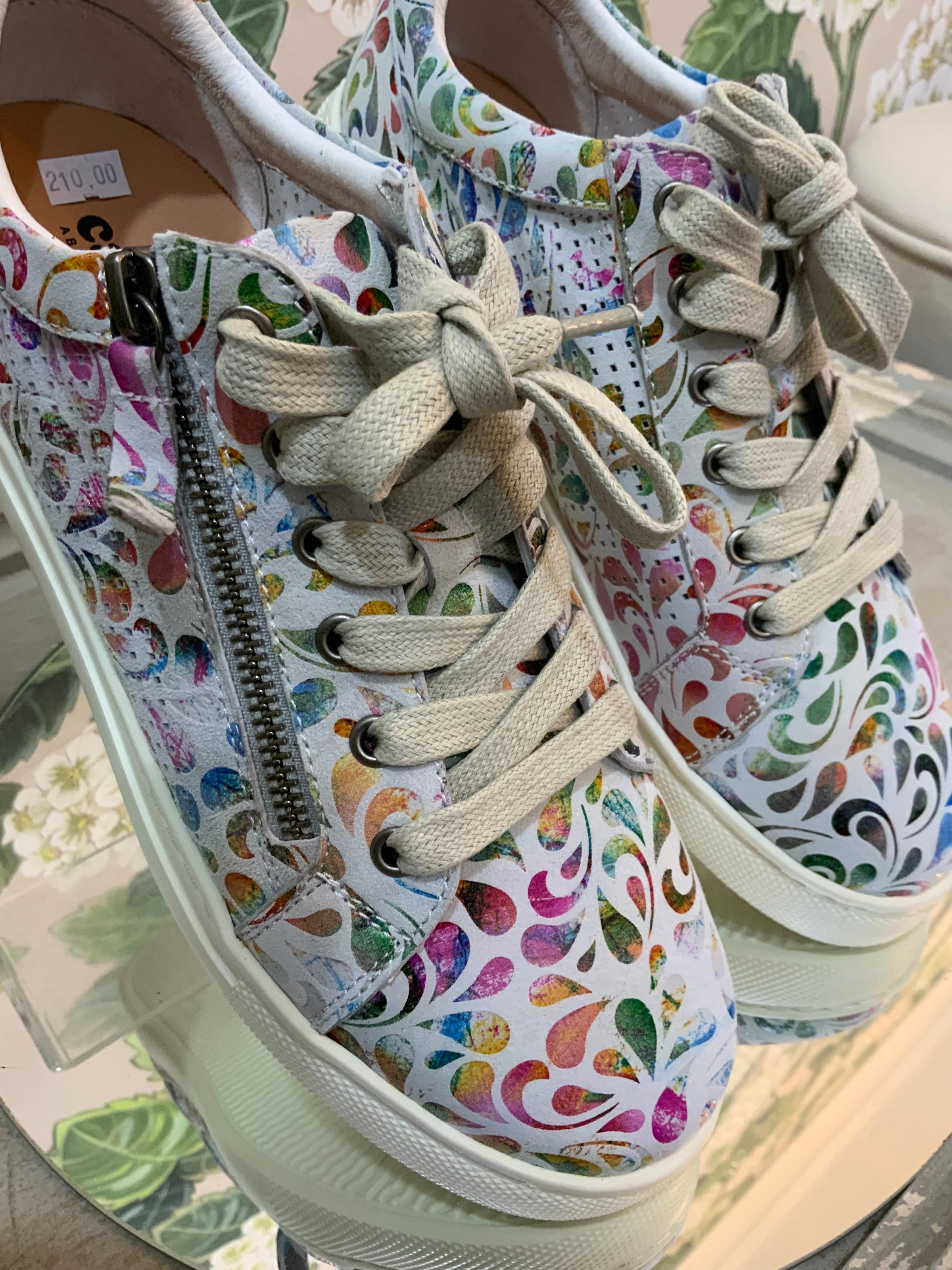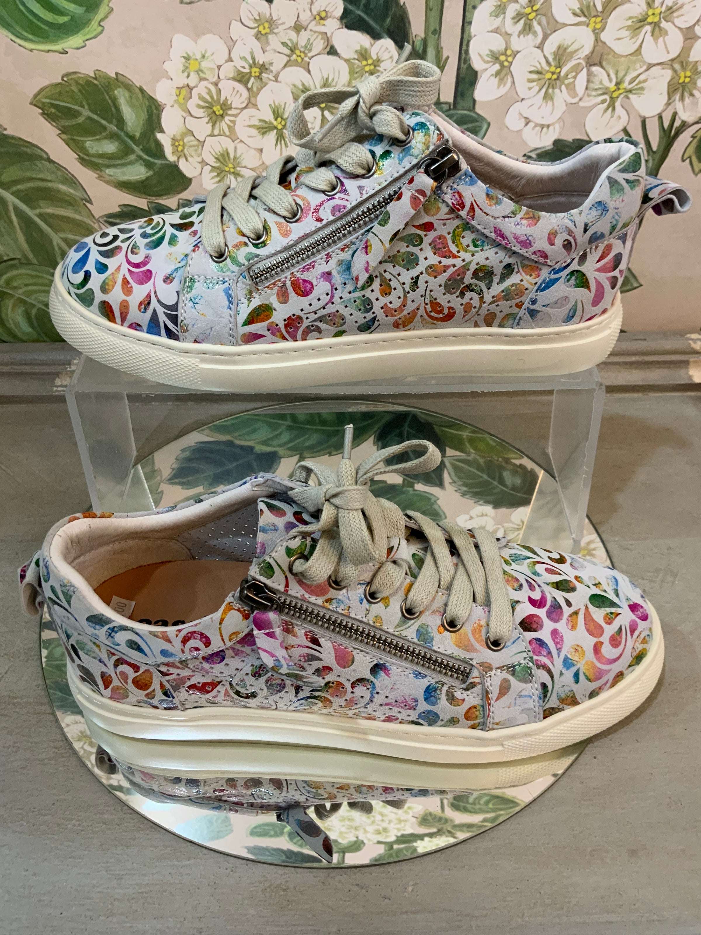 Step into color and comfort with these statement sneakers. Featuring a vibrant multicolored print over soft white leather, they add a playful yet polished edge to your everyday style. A side zipper makes them easy to slip on and off, while the cushioned sole ensures all-day comfort. Whether paired with denim or used to elevate a casual dress, these sneakers strike the perfect balance of fun and function.