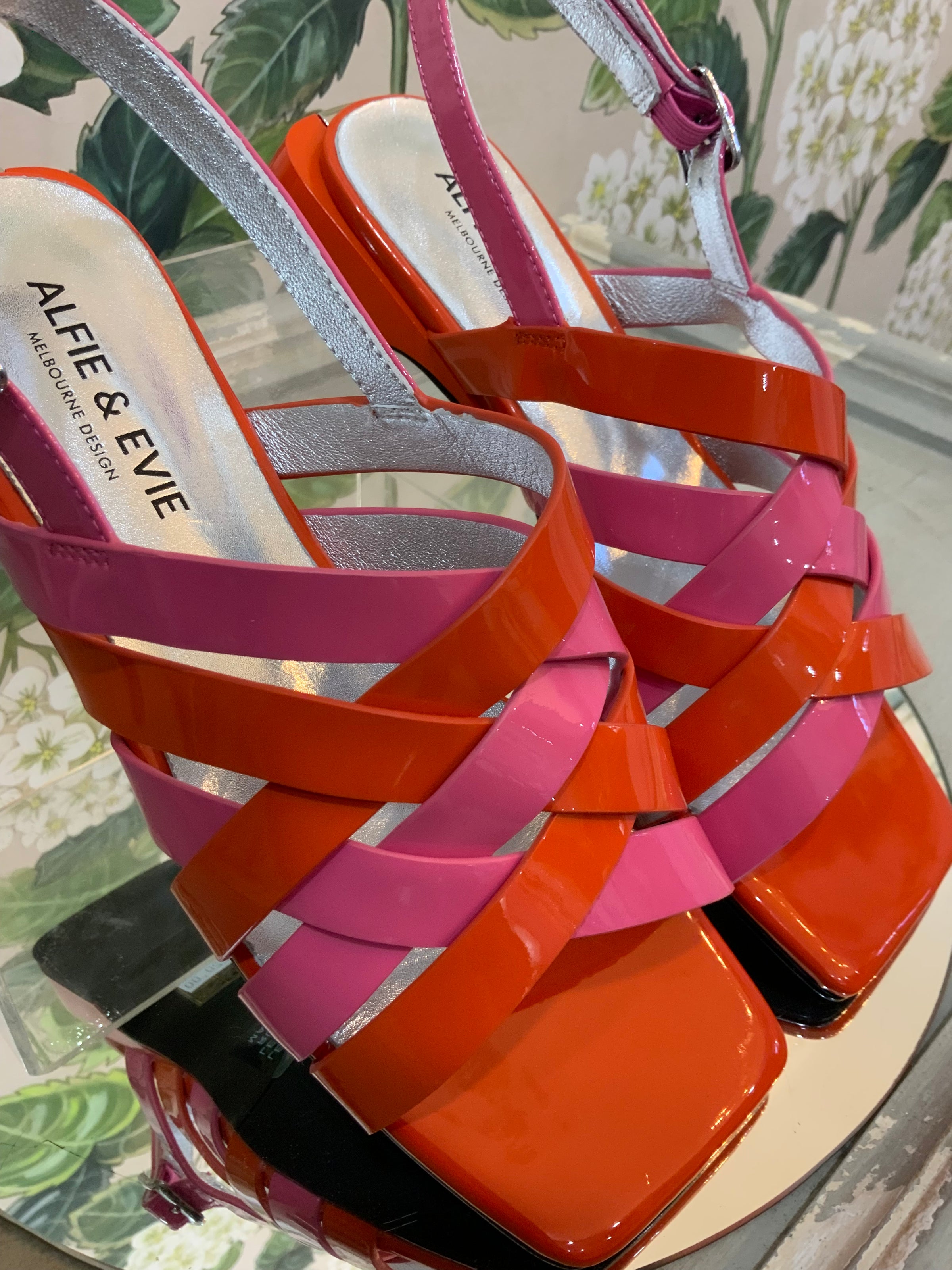 Turn every step into a statement with these vibrant platform sandals by Alfie & Evie. Featuring striking pink and red patent straps in a criss-cross design, they deliver both comfort and style with a secure buckle fastening and supportive platform base. The squared-off toe and chunky sole give them a sleek, fashion-forward edge that makes them perfect for standing out at any occasion.